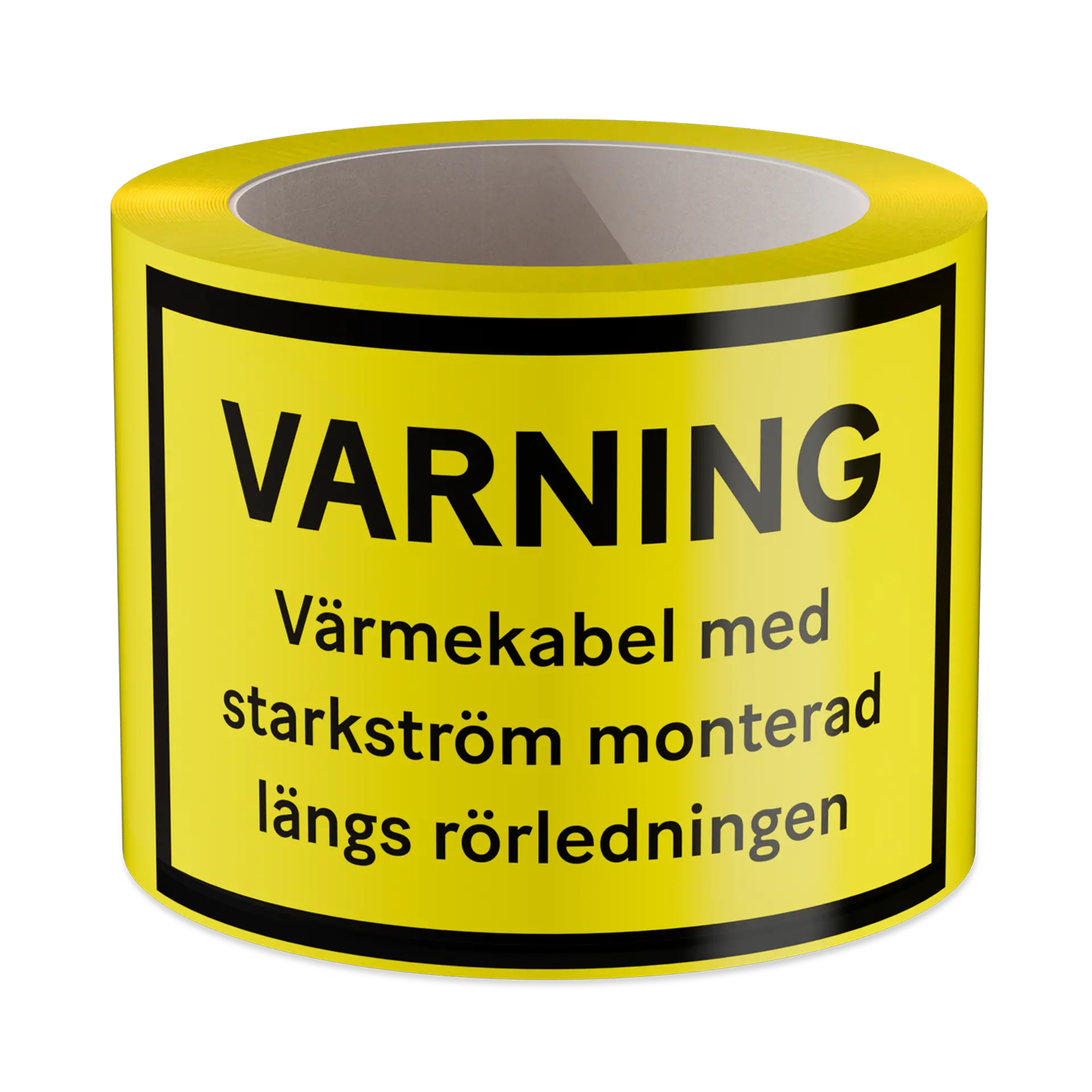 Gul varningstejp för värmekabelanläggningar. Informerar om att värmekabel är installerad på rör.